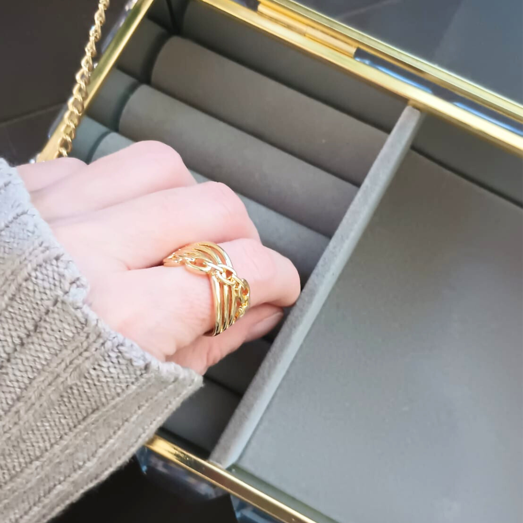 Anillo oro laminado, Gold filled 18 kt, multilayer, anillo de cadena xoxo de moda.
