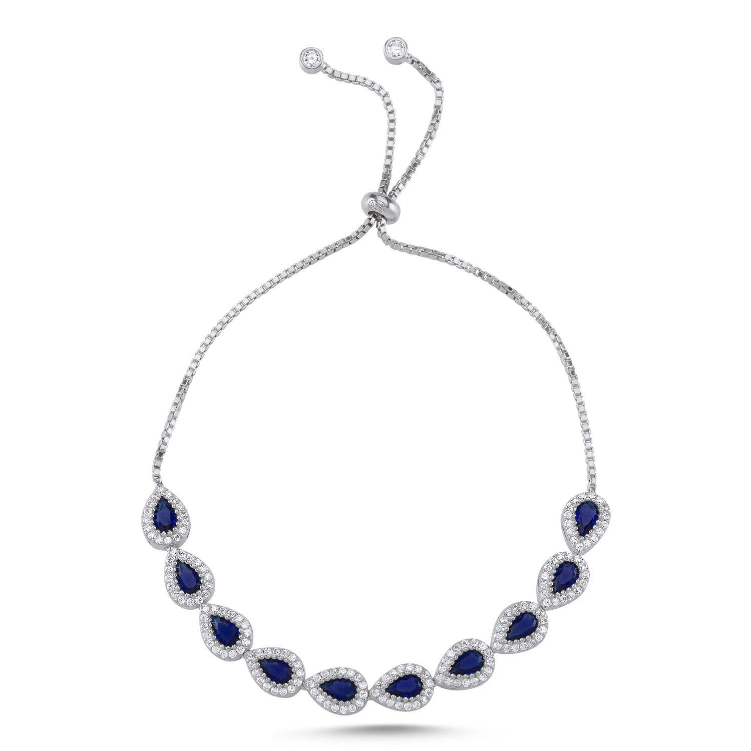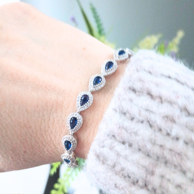 Pulsera plata 925 sterling silver deslizante ajustable con circonita cúbica y zafiro en forma de lágrima.