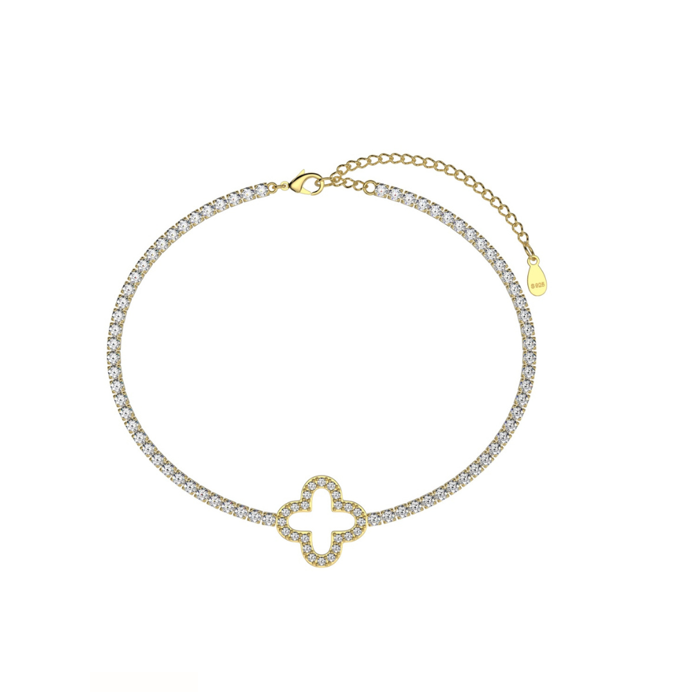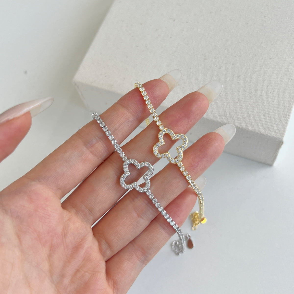 Pulsera en plata 925 estilo clover trebol de cuatro hojas sterling silver circonita cubica, con baño de oro de 18 kt.